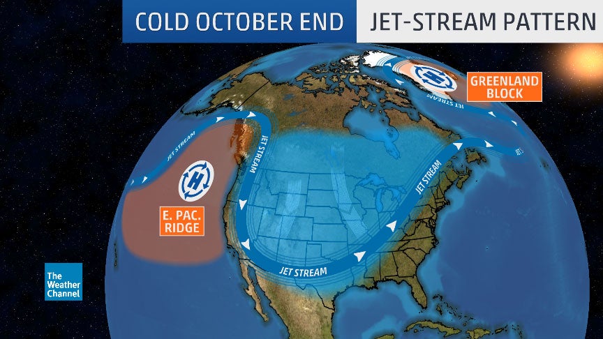 The overall jet stream pattern setting up for the end of October, funneling colder air into the Rockies, Plains and Midwest.