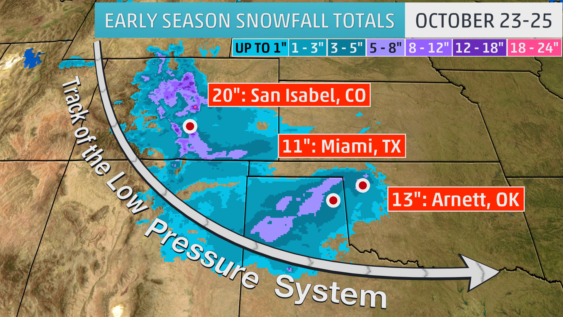 Snow accompanied this first front late Wednesday into Thursday along the Front Range of the Rockies and adjacent High Plains, including the Denver metro area and parts of the Texas Panhandle.