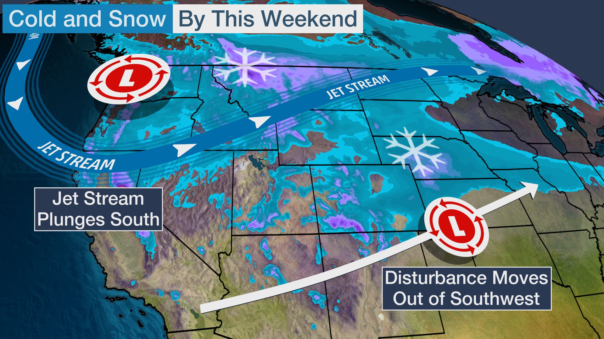 Moisture from a disturbance pushing out of the Southwest will overlap with that colder air and produce snowfall in parts of the Plains, Midwest and Rockies. At the same time, a disturbance diving southward into the Northwest will produce snowfall in parts of that region.