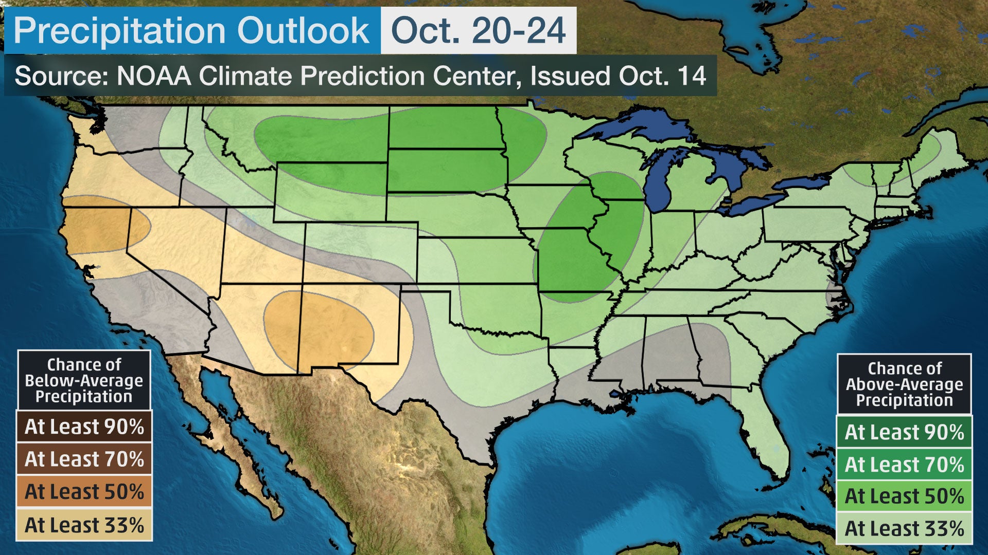 Several cold fronts will bring cooler temperatures along with some wet weather across the northern tier into the Midwest during the second half of October. Rain is also expected in parts of the East at times during the next couple of weeks.