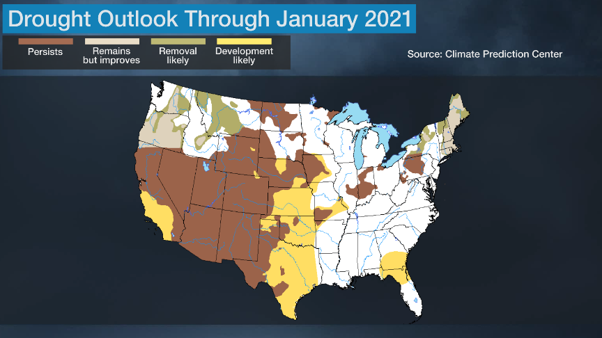 Unfortunately, drought conditions are anticipated to persist and expand through December from California into parts of the Plains, Midwest and possibly parts of the Southeast.