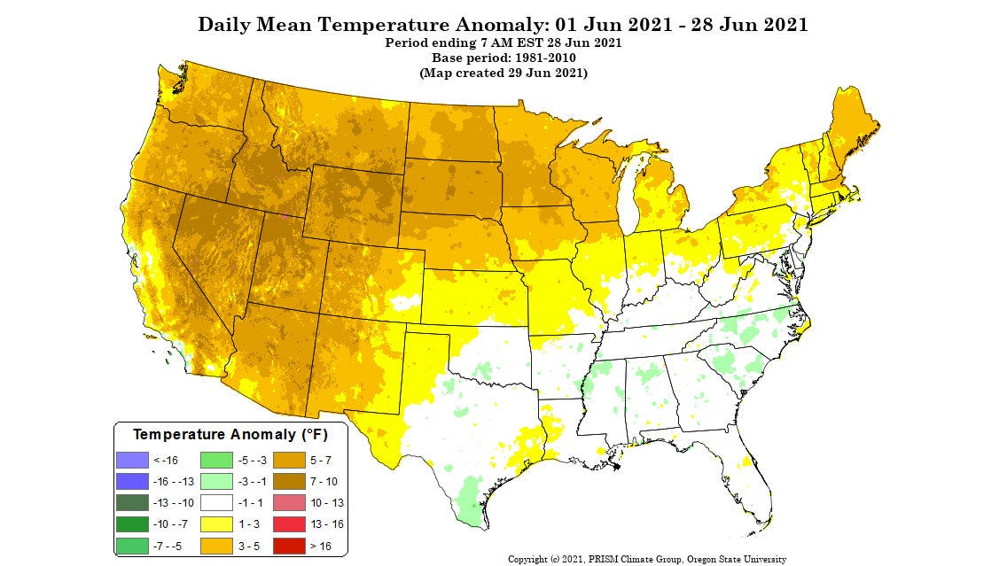 Temperatures compared to average June 1-28, 2021. Orange and yellow shadings were above average. The white and green shadings show areas near and slightly below average, respectively.