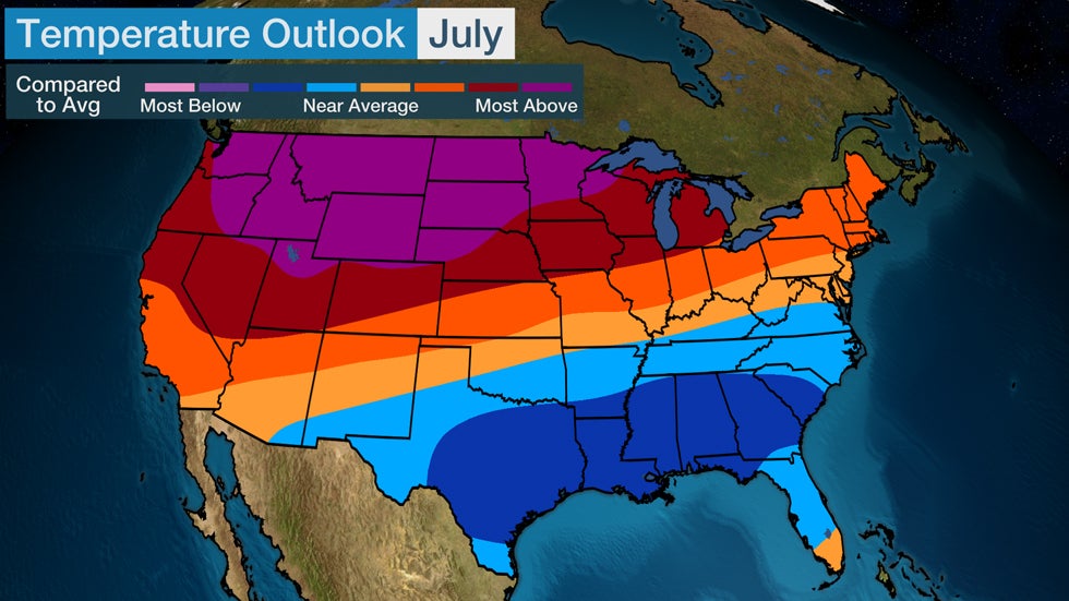 July's forecast is nearly a carbon copy of what much of the United States experienced in June, with a split between hotter-than-average conditions in the western and northern U.S., and the South escaping the worst of summer's searing heat.
