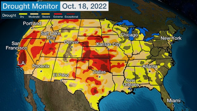 Drought Monitor analysis as of Oct. 18, 2022, shows the majority of the Lower 48 states as either abnormally dry (bright yellow contour) or in various stages of drought.