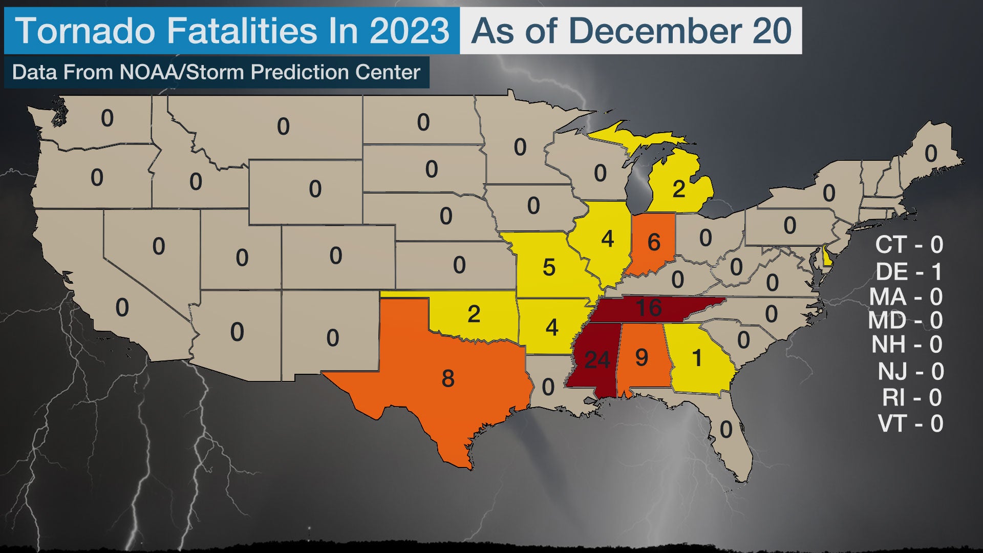 It was a notable jump from 2022 when there were only 23 tornado fatalities. 2023 had the second-highest number of deaths in the past 10 years. The number of tornadoes was slightly above average, with over 1,400 preliminary tornadoes according to NOAA's Storm Prediction Center.