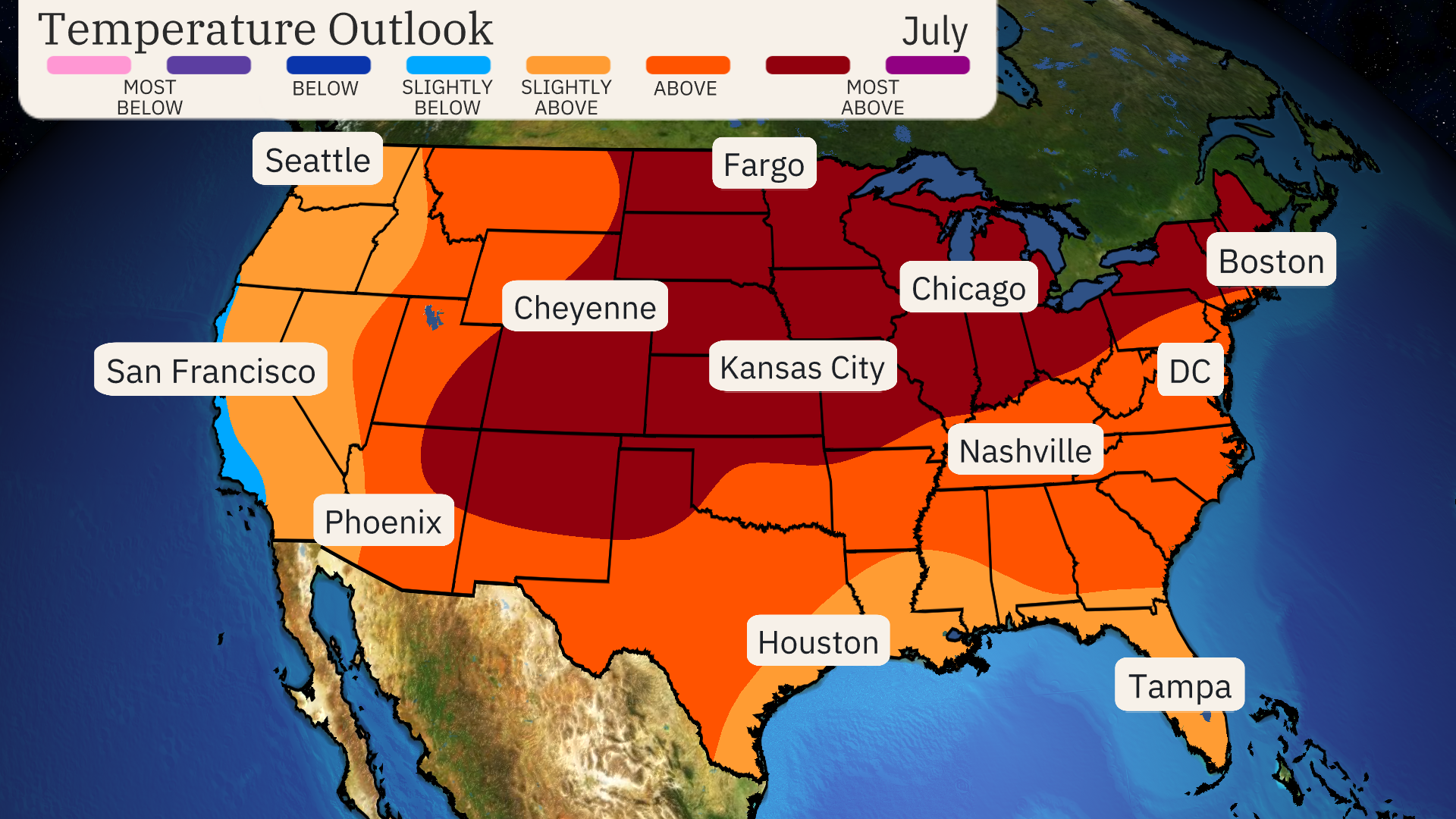 A​ir conditioners could be working overtime for many by July. The hottest conditions relative to average are forecast from New England and the interior Northeast into the Midwest, Northern and Central Plains and central and southern Rockies. That said, just about everywhere else, from the East Coast to the Mountain West, should be hotter than average.
