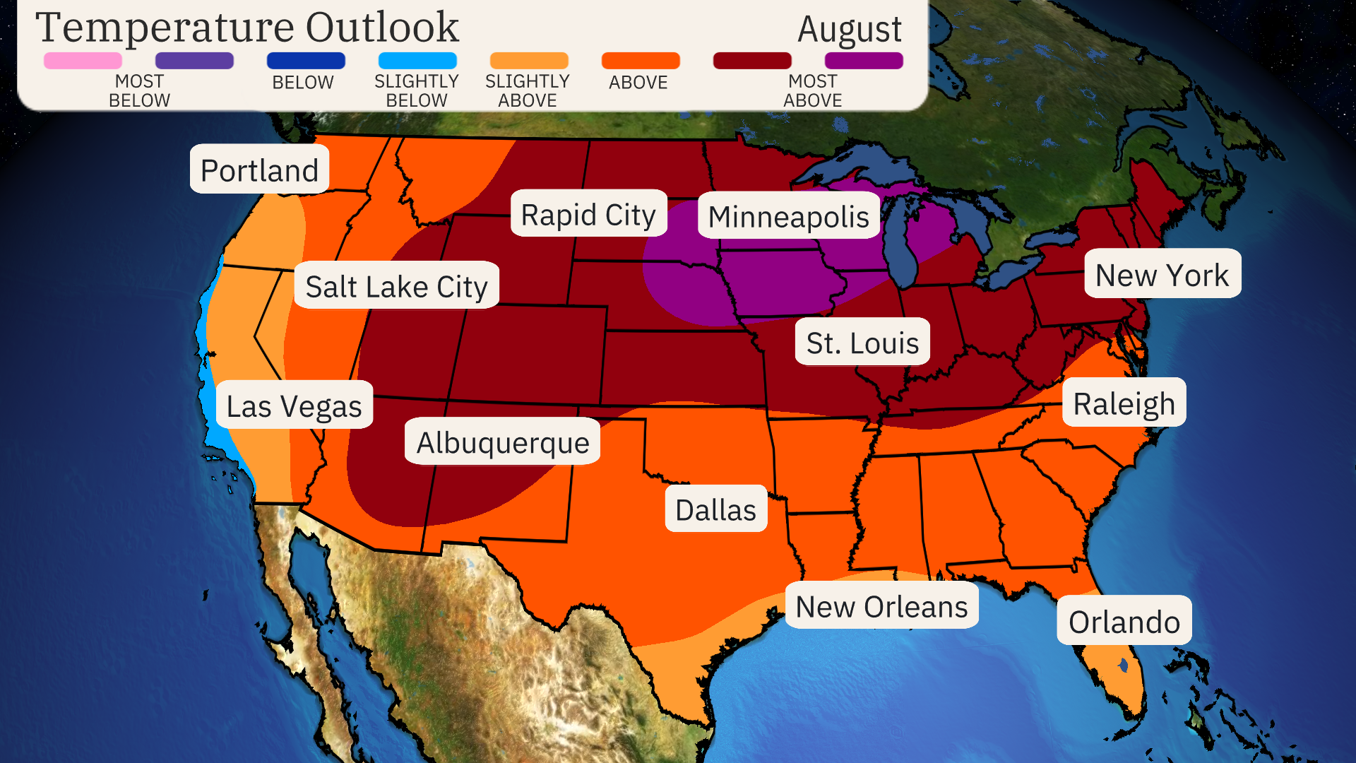T​orrid August outlook could nix early tastes of fall. A broad area from the Northeast to the Midwest, Northern and Central Plains and Rockies might be most above average in summer's final full month. Portions of the Midwest and western and northern Great Lakes could be exceptionally hotter than the August average.