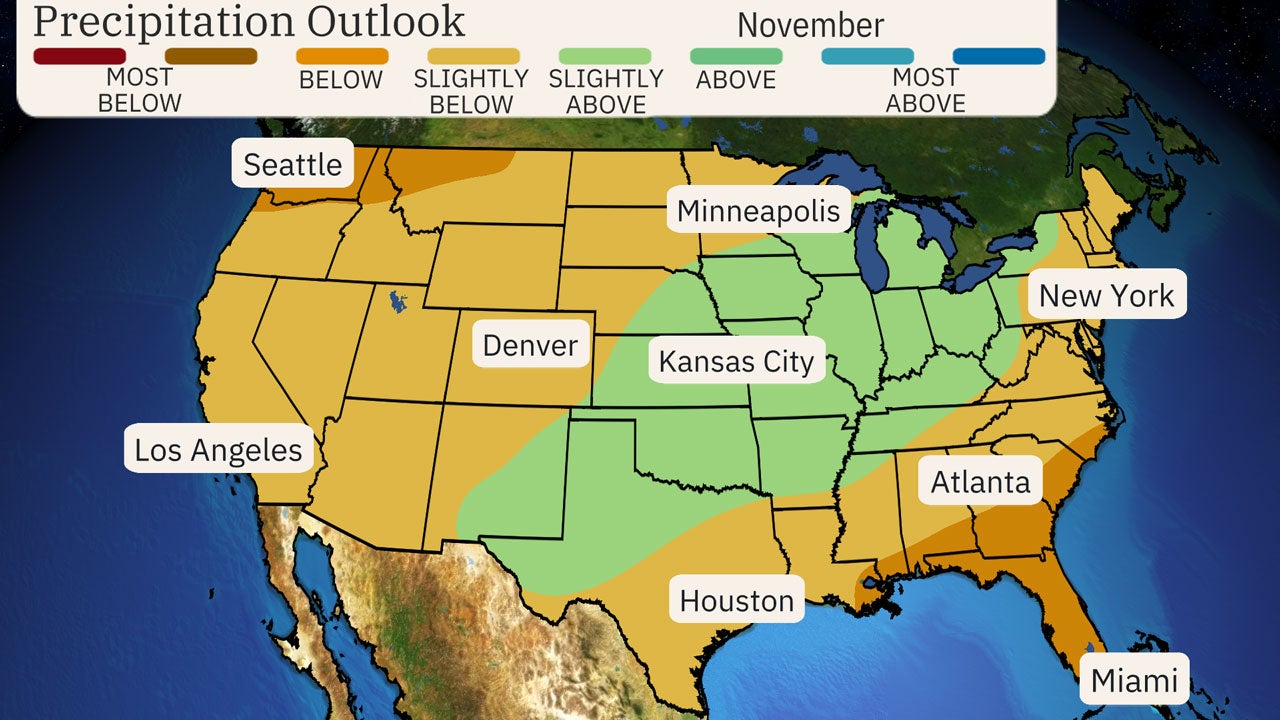 T​hat nation's southeast and northwest corners might have the best odds of being drier-than-average in November.