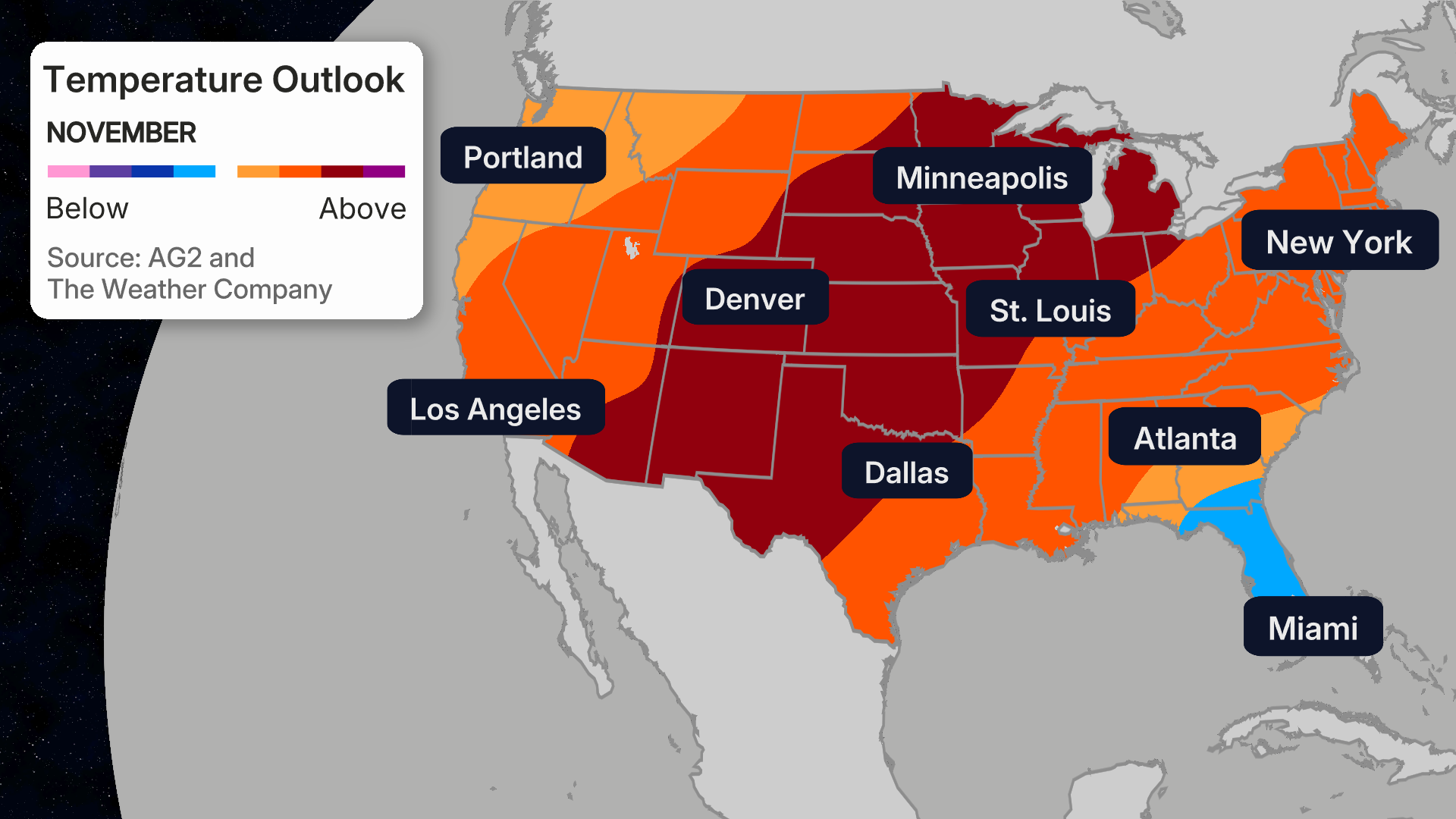 The latest November temperature outlook from The Weather Company and Atmospheric G2 is fresh off the press, and it’s signaling warmth for many, at least early.