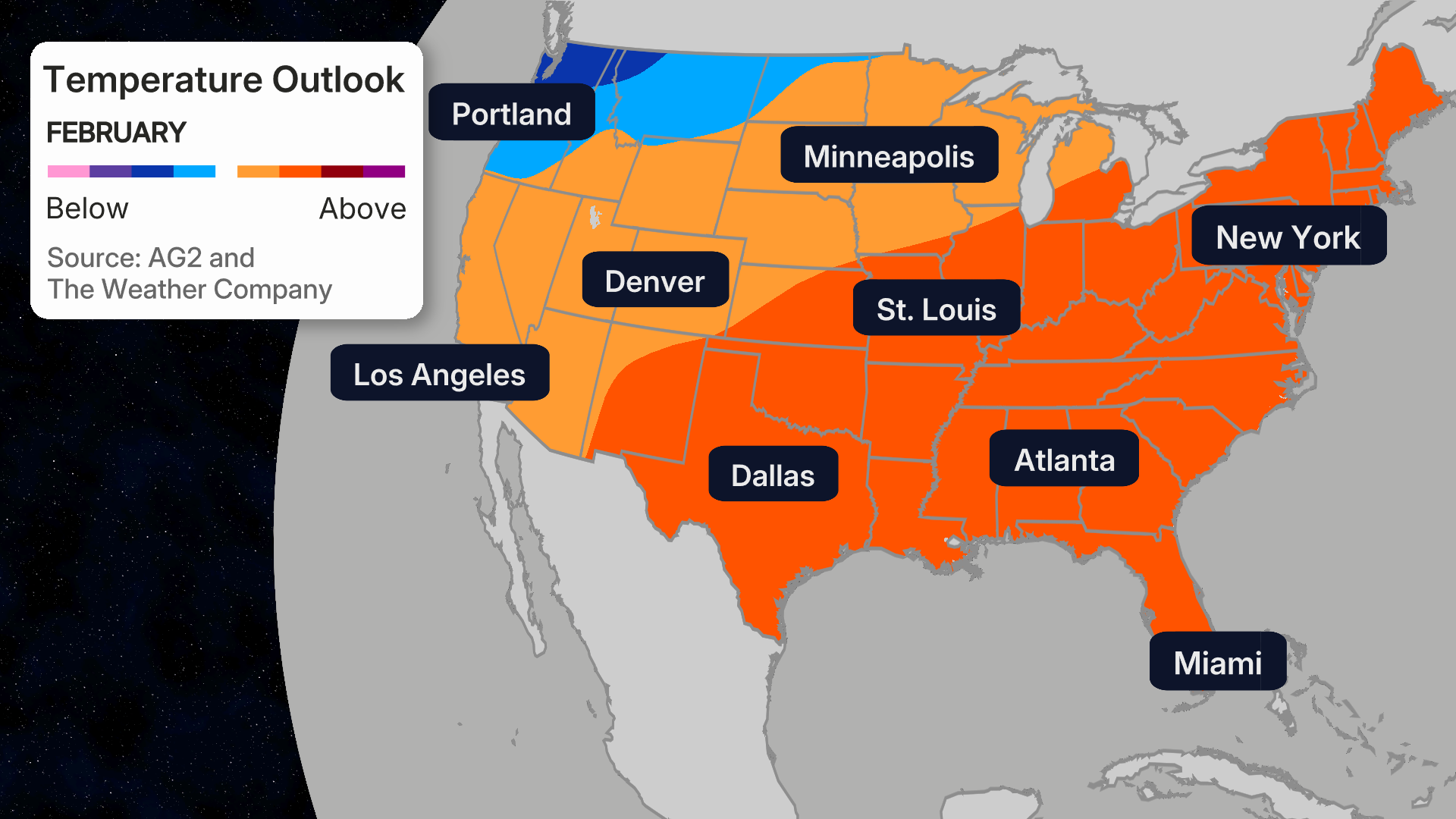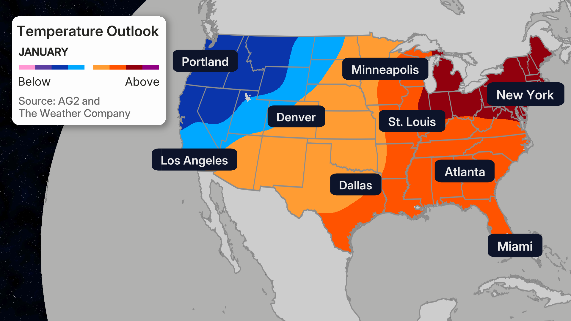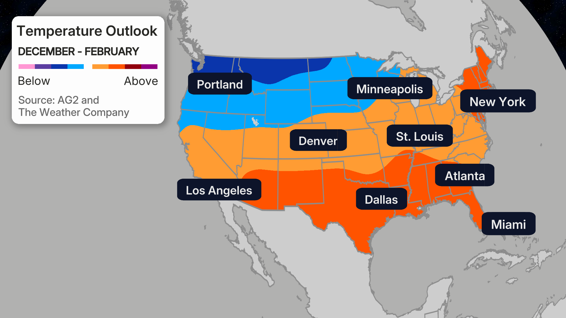 On the other hand, much of the South from the Desert Southwest to Florida, as well as most of the Northeast, is forecast to have a warmer-than-average winter, according to the outlook released Thursday by The Weather Company and Atmospheric G2.