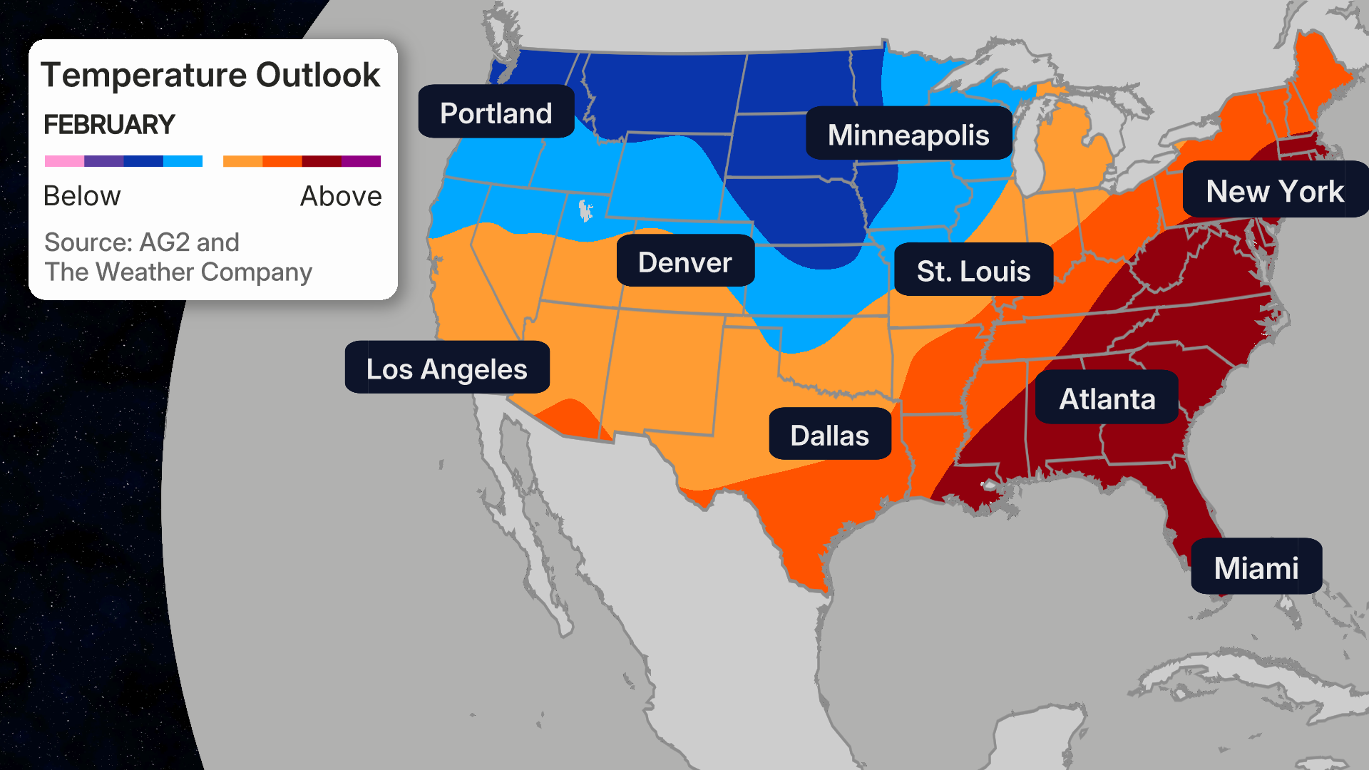 • Without a larger weather feature in play like the polar vortex, conditions are likely to look a lot like La Niña: warmer than average across the southern tier and cooler than average across the northern tier.