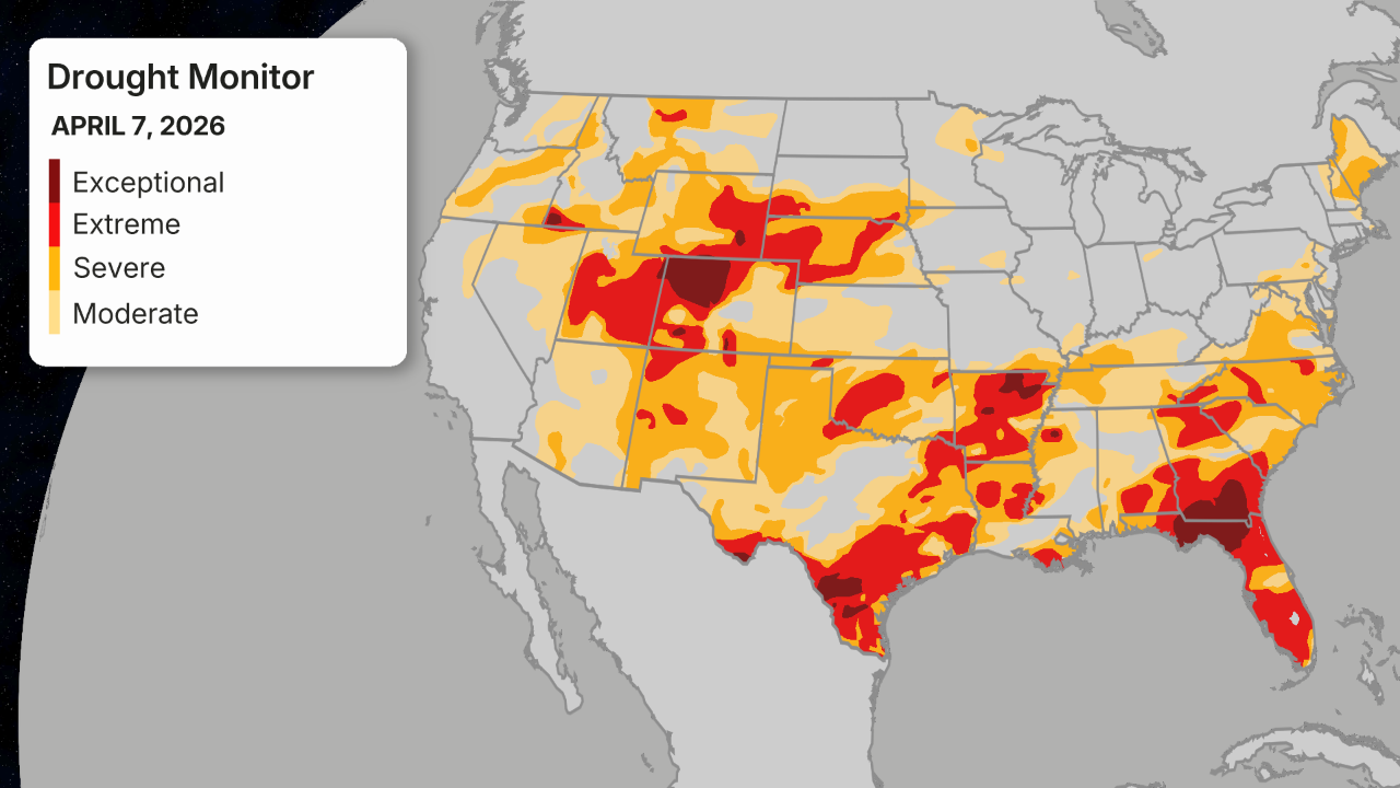 Areas of drought in the Lower 48 states as of the April 7, 2026, Drought Monitor analysis