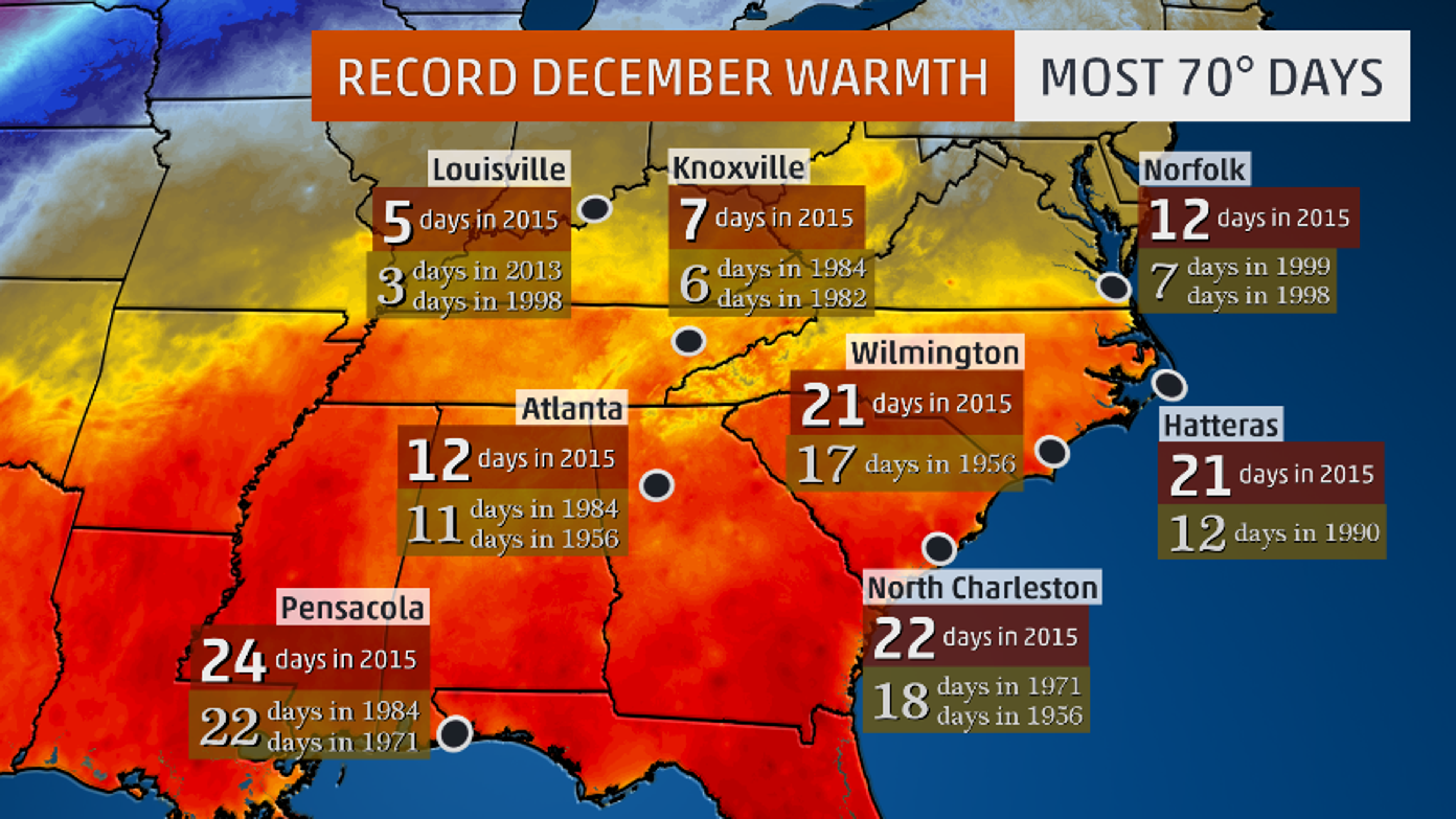These cities had more days with highs at or above 70ºF than any other December on record, according to data from NOAA. Several other cities not shown here also set records in this category, including Huntsville, Alabama; Greensboro, North Carolina; Columbia, South Carolina; and Richmond, Virginia.
