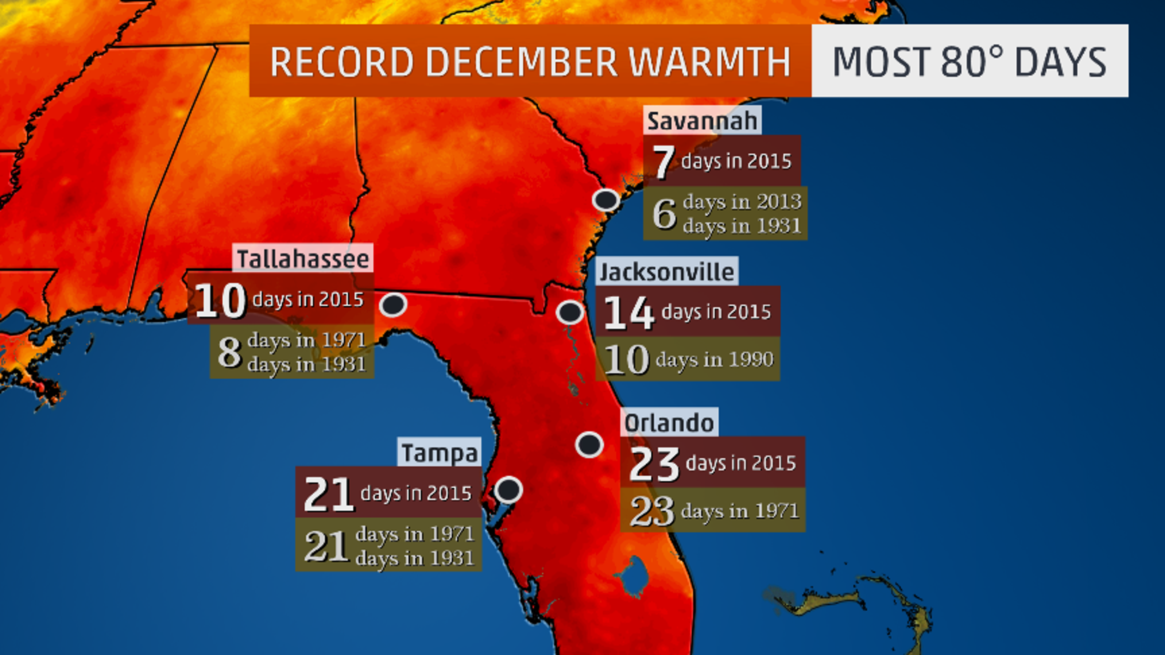 Wednesday (Dec. 30):  Tampa, Florida, tied a daily record high (84 degrees), the seventh straight day tying or breaking a daily record. During this streak, they have tied the all-time December record (86 degrees) two straight days (December 25 and 26). Other daily record highs tied or set include Naples, Florida (88 degrees); Orlando (87 degrees); Daytona Beach, Florida (85 degrees); Miami and Jacksonville, Florida (both 84 degrees); Key West, Florida (83 degrees); Savannah, Georgia (83 degrees); Tallahassee, Florida (80 degrees); and downtown Charleston, South Carolina (78 degrees).