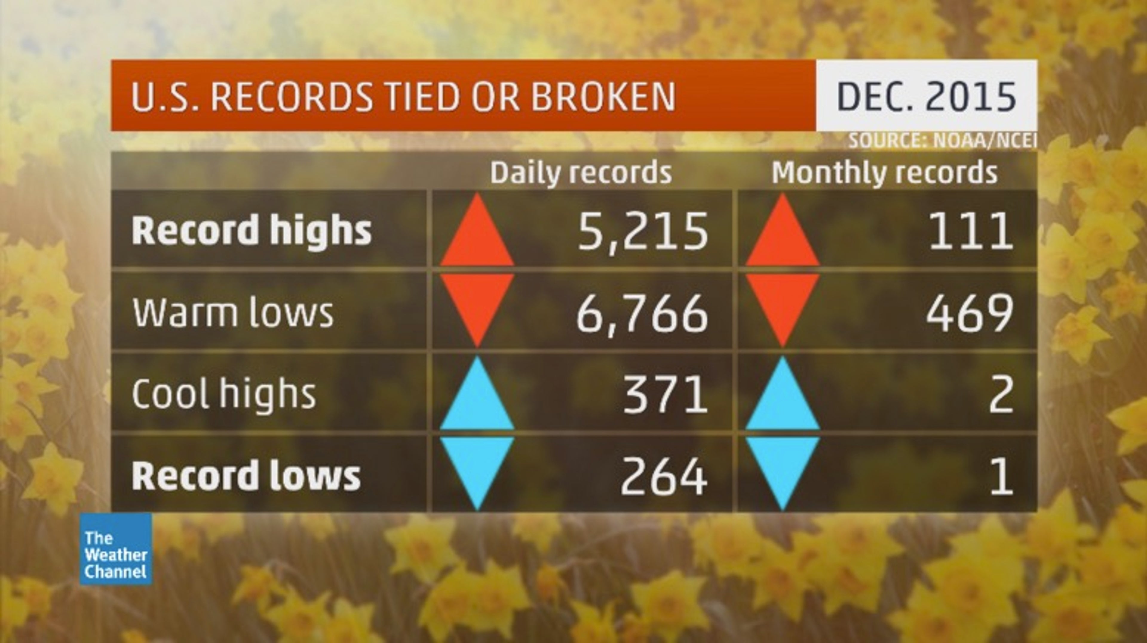 According to preliminary data from NOAA's National Centers for Environmental Information (NCEI), over 5,200 record daily highs were tied or broken across the U.S. in December 2015. An additional over 6,700 record-warm daily low temperatures have been set during the same time period.