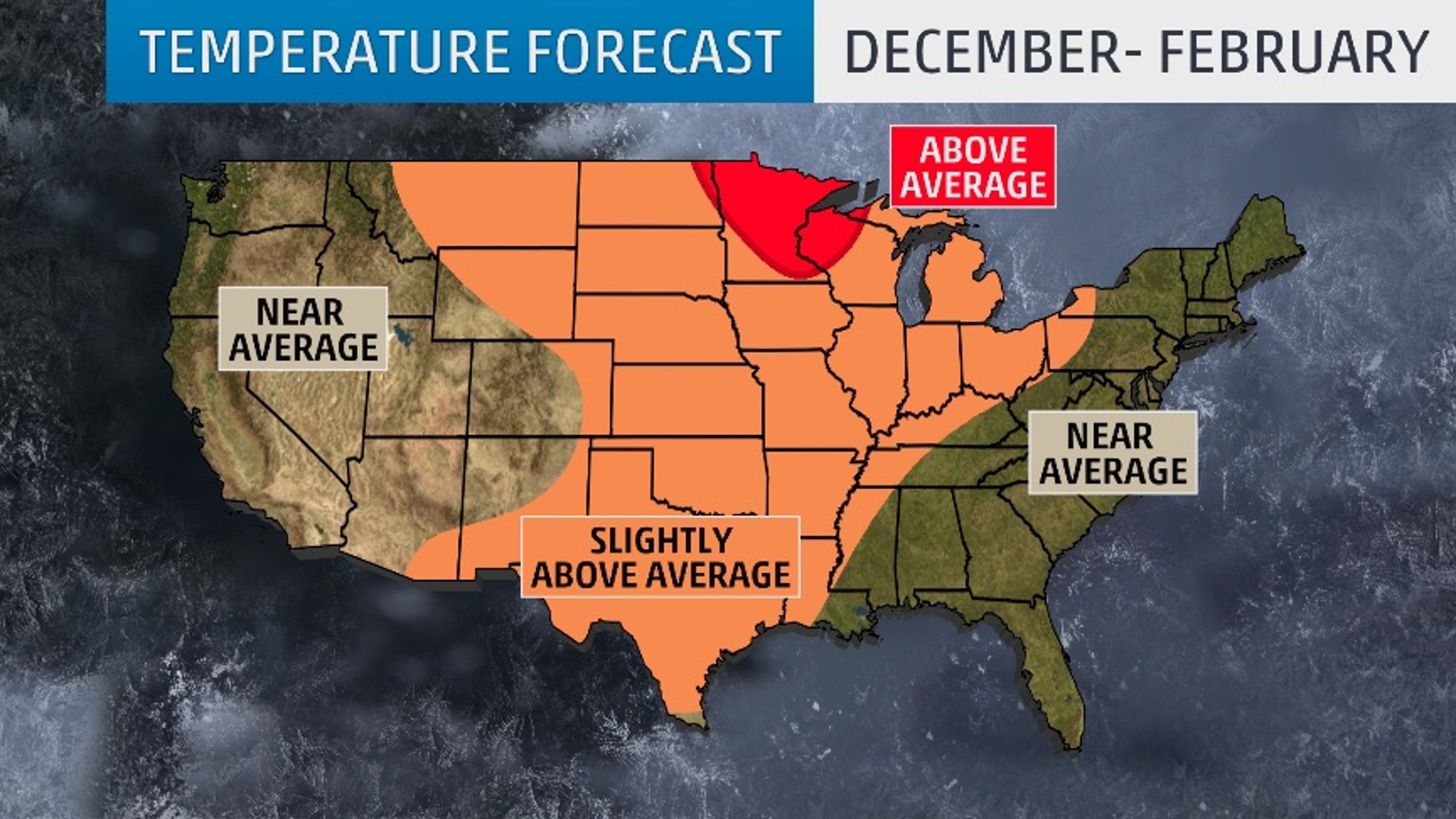 Elsewhere, near-average temperatures will be found along the East Coast and into much of the Midwest and West.