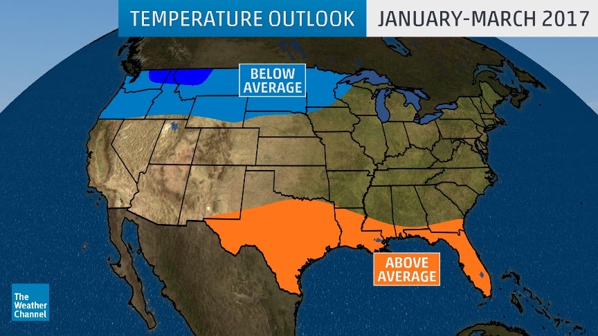 Pictured here is the January-March 2017 temperature outlook. Areas not shaded have an equal chance of above- or below-average temperatures.