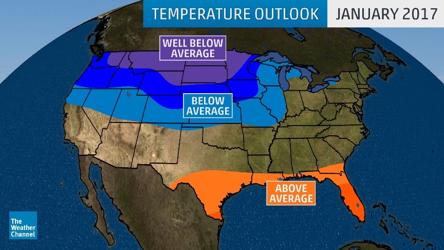 January 2017 is now expected to be much colder than average from the Pacific Northwest into the upper Midwest, while parts of the Gulf Coast states will see a mild January, according to an outlook released Wednesday by The Weather Company, an IBM Business.