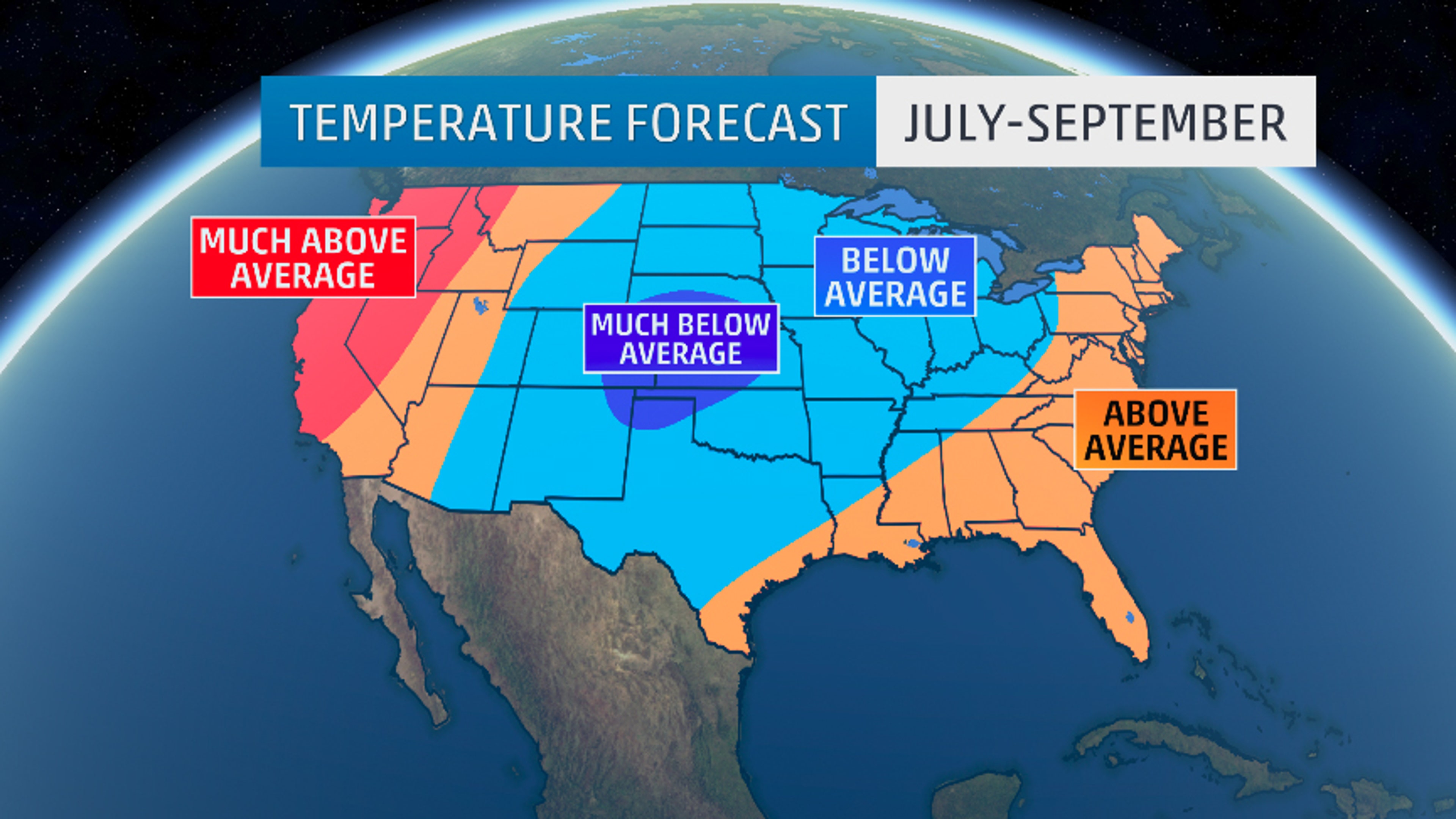 The next three months are expected to feature relatively cool conditions in the central states while the West endures more above-average warmth, according to a late-summer temperature forecast for July, August and September released by The Weather Channel Professional Division on Tuesday.