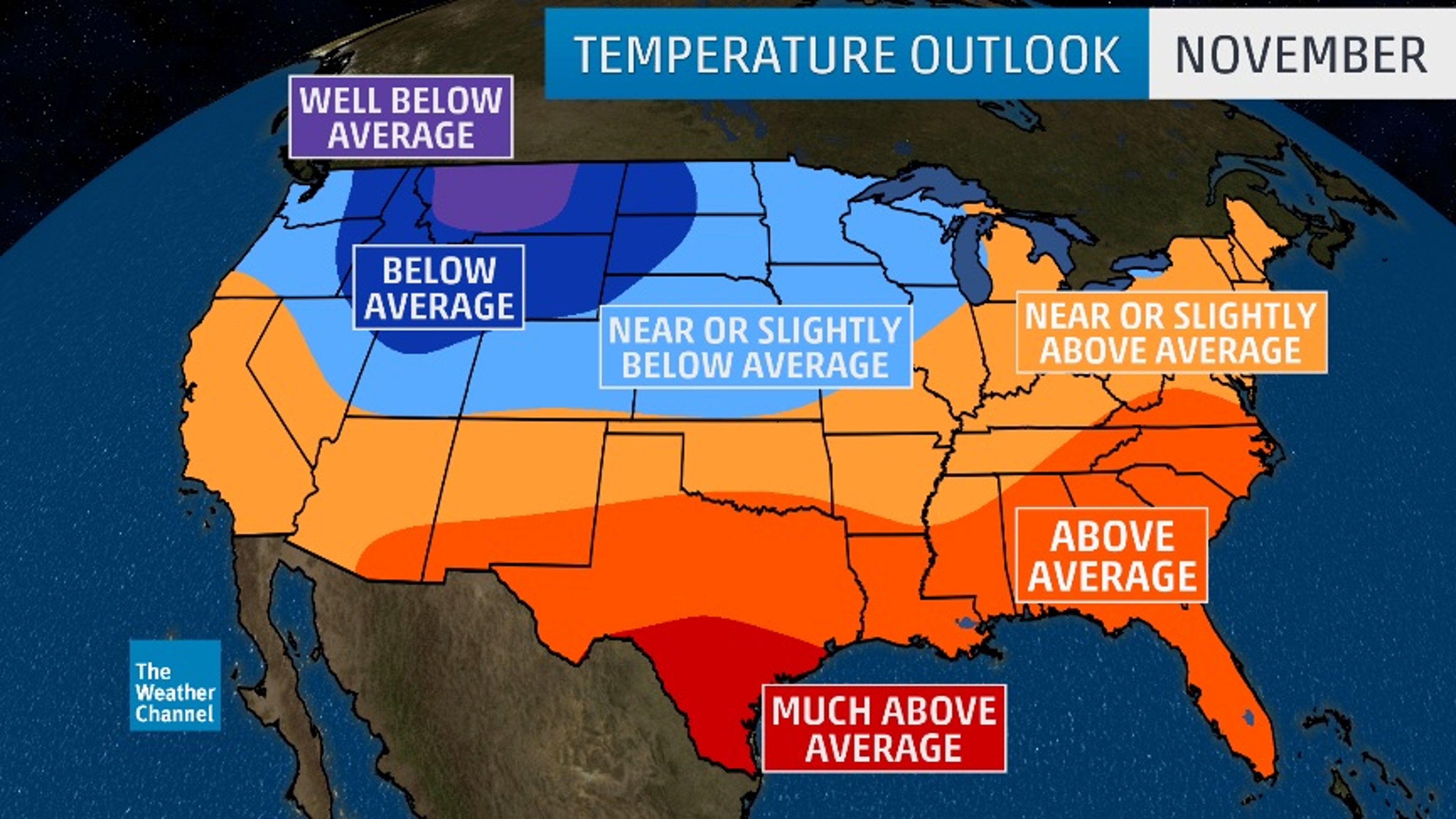 November will bring above-average temperatures in the southern tier of the U.S. and below-average temperatures in the northern Rockies and northern Plains.