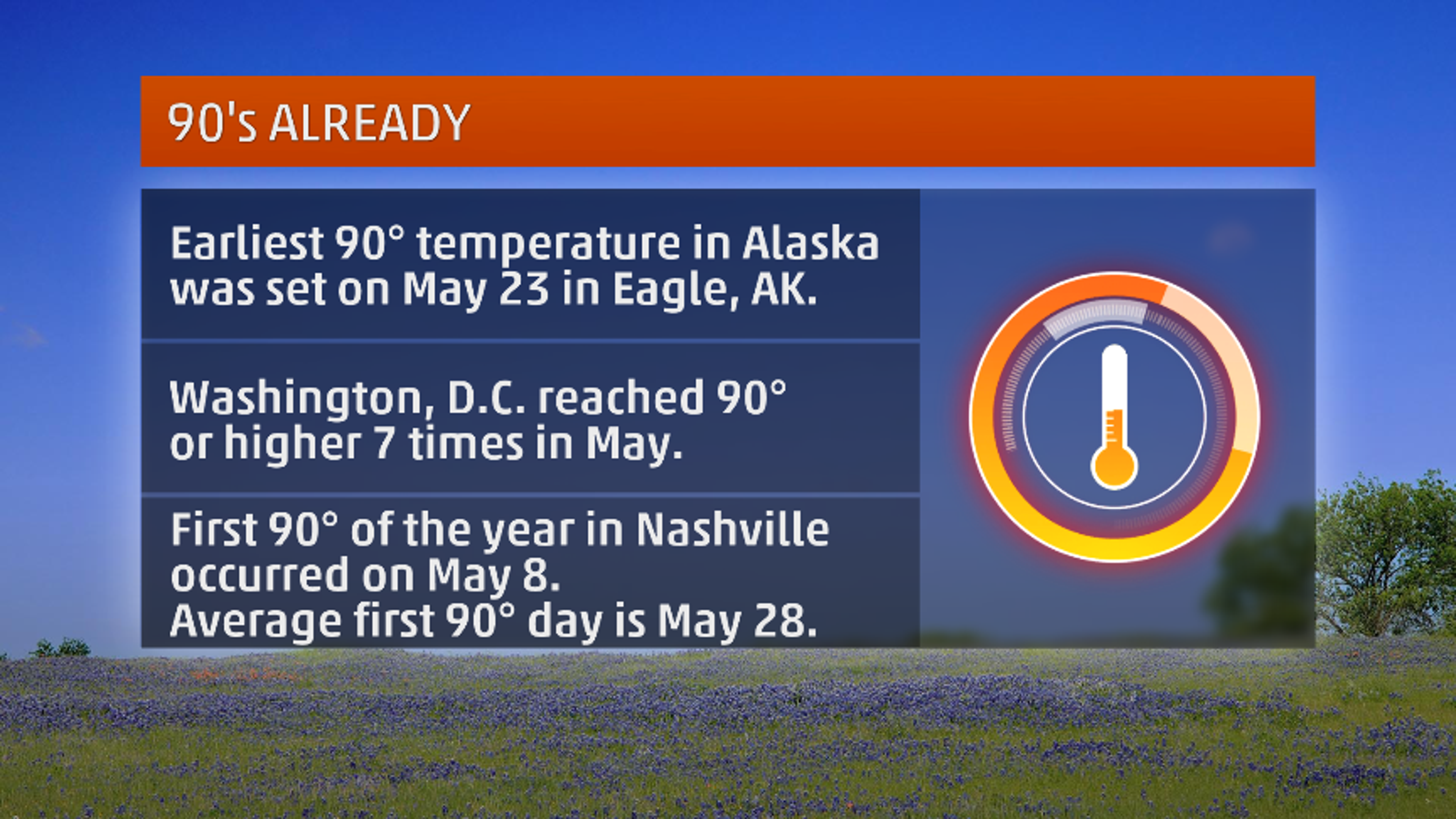 Earlier we talked about Memphis staying cool, but that's not the case in Tennessee's second largest city. Nashville reached 90 degrees on May 8 and 92 on May 10, which is about three weeks sooner than average.
