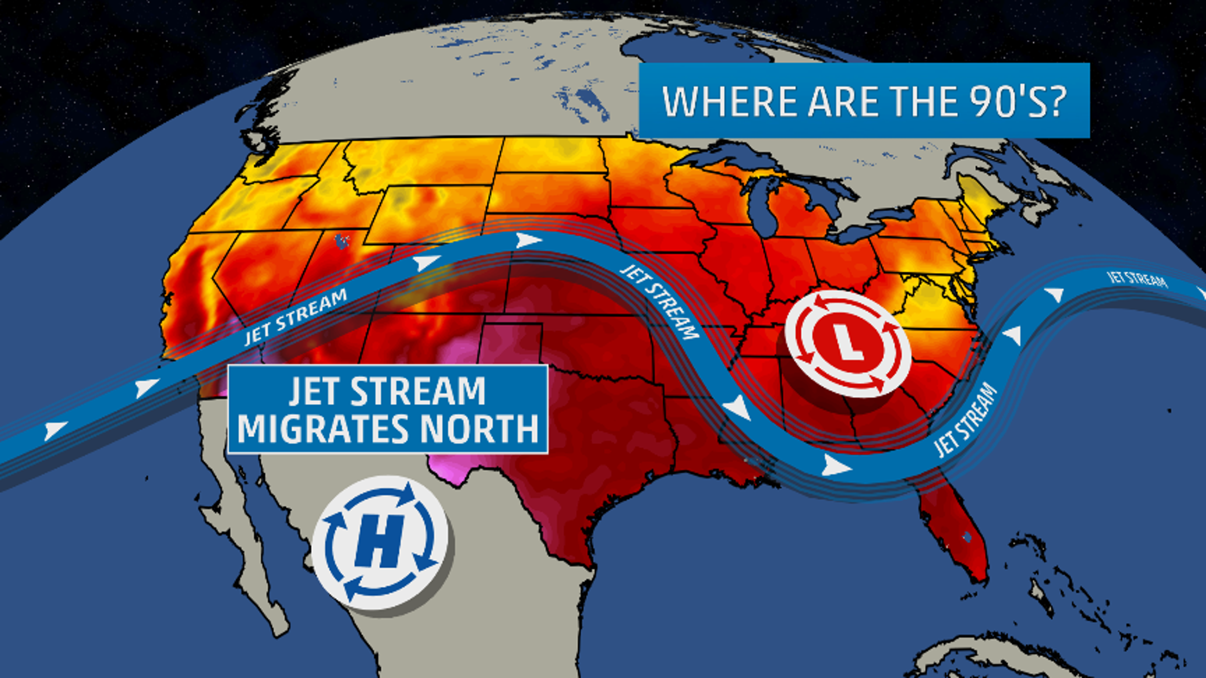 No, we are not talking about the 1990’s, but instead temperatures in the 90s. The reason for the lack of high heat has been a southward dip in the jet stream, along with a series of disturbances that brought record rainfall to the southern Plains.