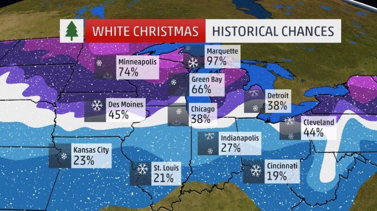 Historical probability of a white Christmas in any year for the Midwest.
