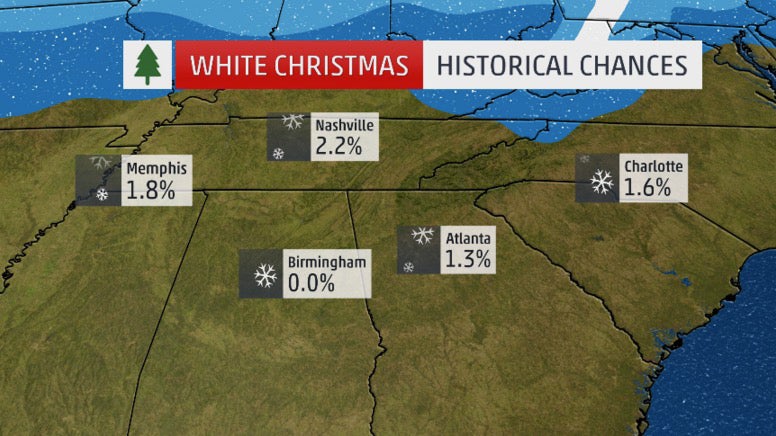 Historical probability of a white Christmas in any year for the Southeast.