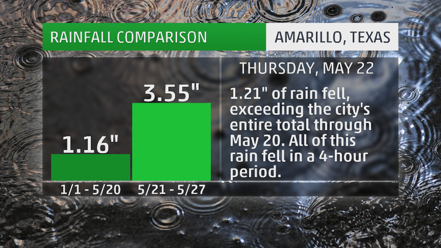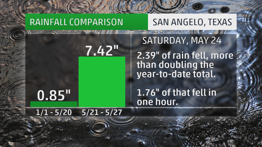 But the torrents kept coming, with over 2 inches of rain on both May 24 and 25, and nearly 2 inches again on May 26. By the time the large-scale storm system finally moved out, San Angelo had logged 8.7 times more rain in one week than in the previous 20 weeks put together.