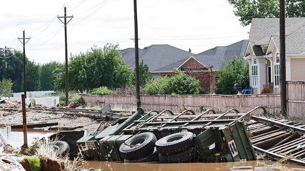 An M-923 U.S. military logistical transportation vehicle lies on its side in a ditch in Longmont after being washed away by floodwaters as local residents were cleaning up in the wake of heavy flooding on Sept. 16, 2013, in Longmont, Colo. (Marc Piscotty/Getty Images)