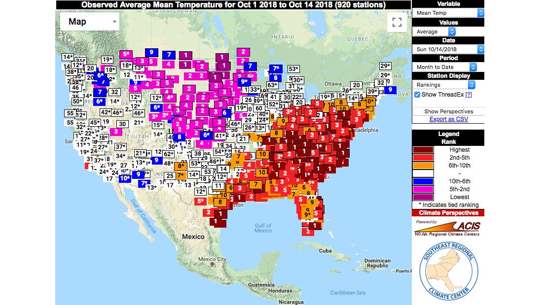 Through Oct. 14, many sites saw one of the warmest October-to-date on record, according to the Southeast Regional Climate Center. This includes Washington D.C., which saw its warmest first half of October on record, with an average temperature of 71.8 degrees. The warmest start to October was also recorded in Allentown, Pennsylvania; Atlantic City, New Jersey; Charleston, South Carolina; New Orleans and Brownsville, Texas.