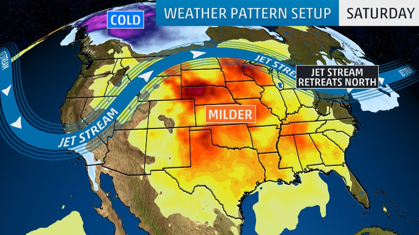 The jet stream will retreat northward toward the Canadian border this weekend, allowing milder temperatures to return to areas dealing with the bitter cold this week.