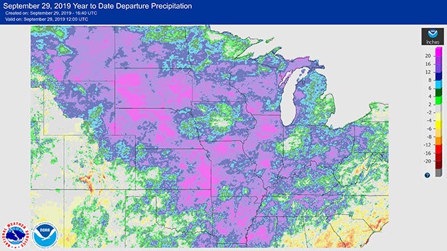 Year-to-date precipitation departures from average as of Sept. 29, 2019. Areas in the purple contours have precipitation surpluses so far in 2019 of at least 12 inches, according to this analysis.