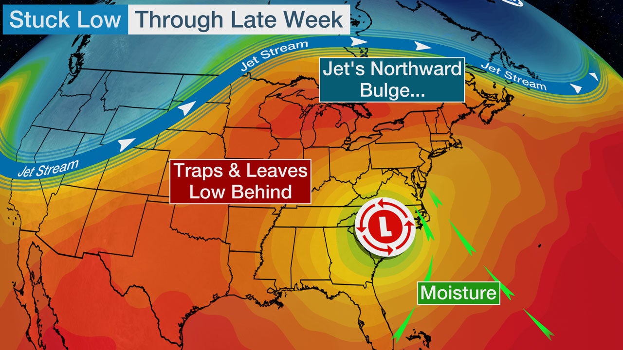 The second part of this wet setup was an upper-level swirl of low pressure which parked itself over the East. This low was expected to sit in place into late week since it was cut off from the steering winds of the jet stream. Meteorologists call this feature a "cutoff low."