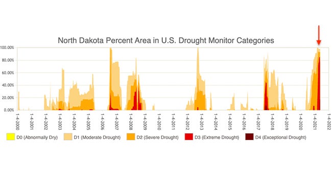 Exceptional drought is now in place over part of North Dakota. It's the state's most widespread and intense drought this century.