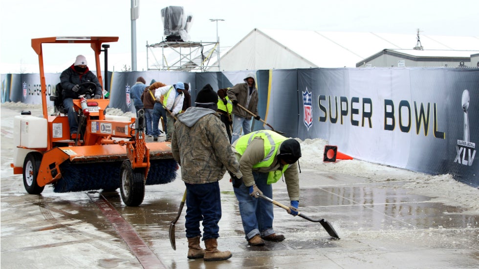 Workers clear ice outside of Cowboys Stadium on Feb. 3, 2011, three days before Super Bowl XLV between the Green Bay Packers and Pittsburgh Steelers.