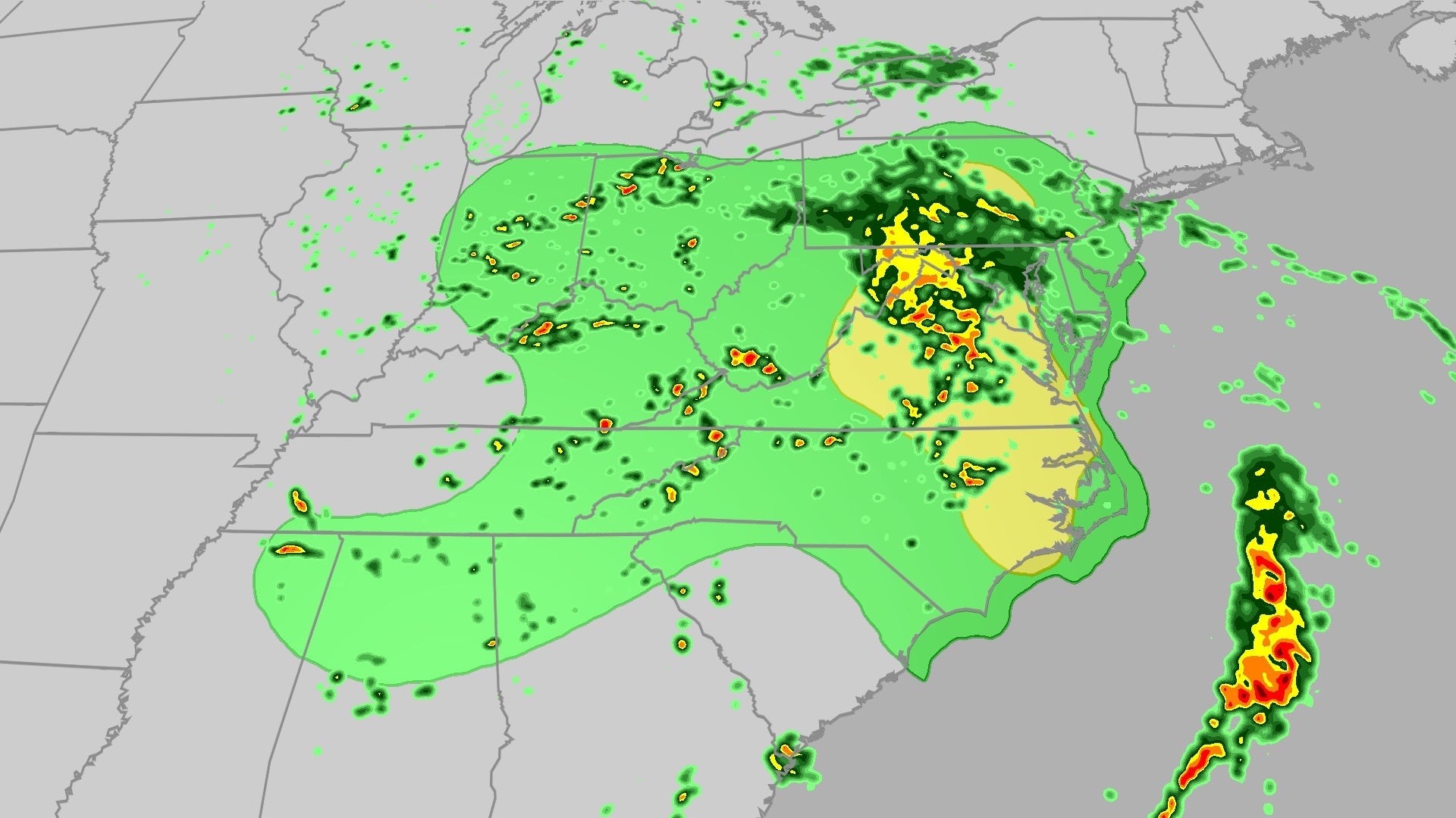 Scattered showers and thunderstorms will linger over the Southeast today, but the greatest chance of localized flooding will shift north into the mid-Atlantic and the adjacent Appalachians. That includes parts of the Washington, D.C. metro and Richmond and Norfolk, Virginia.