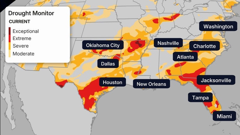 As you can see in the map below, much of the South was in drought at the time of the storm. Parts of Arkansas, Florida, Oklahoma and Texas were in extreme drought as of mid-February.