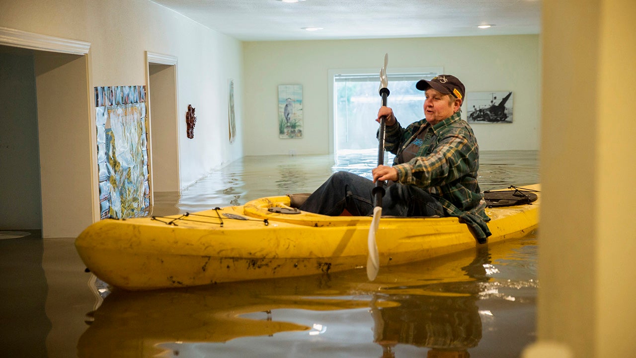 Lorin Doeleman uses a kayak to check her flooded home on Wednesday, Jan. 11, 2017, in Guerneville, Calif. She is moving her belongings to her Sacramento home. Forecasters said the brunt of a weather system had passed after delivering the heaviest rain in a decade to parts Northern California and Nevada. (Santiago Mejia/San Francisco Chronicle via AP)