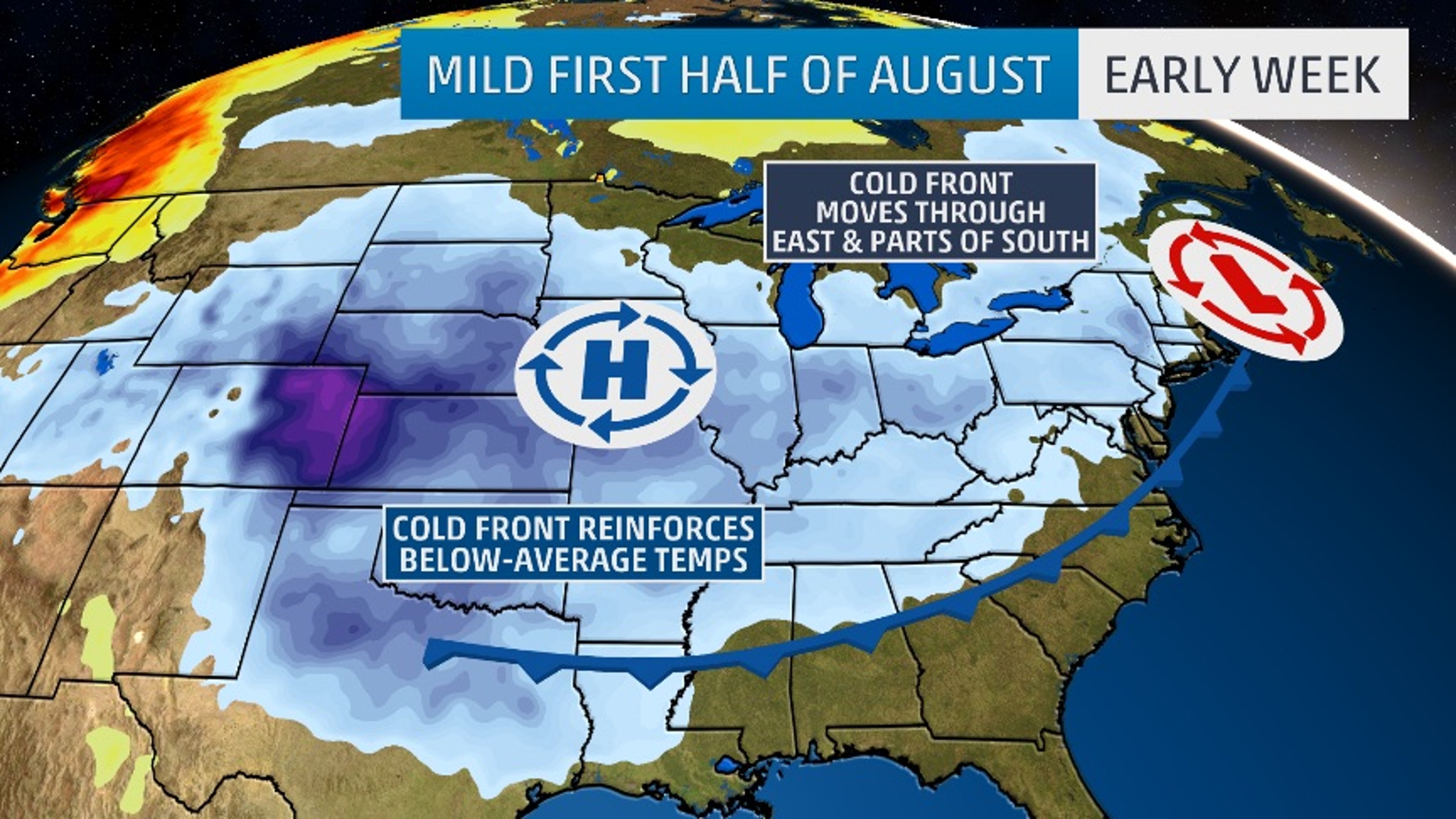 Behind this front, cooler-than-average temperatures are making another appearance. Below is a closer look at this mild early-August forecast.