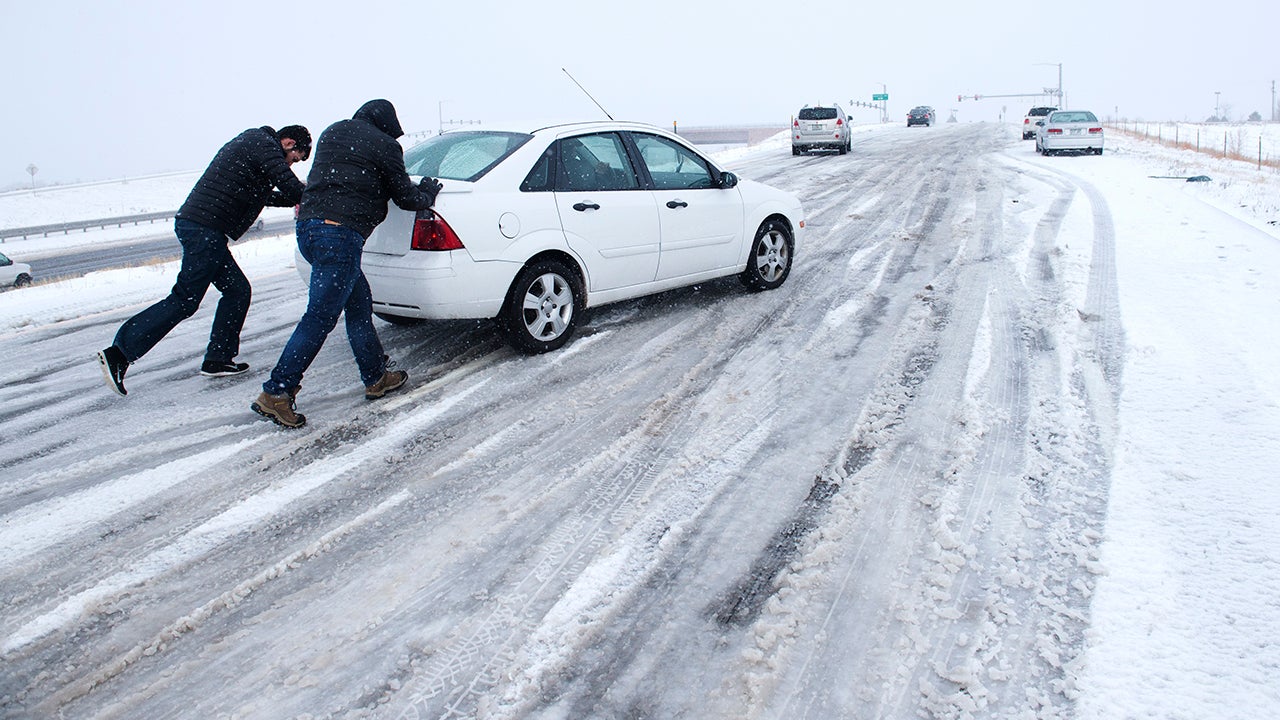 Curtis Hansen, left, and Jeff Malley push a motorist up the icy northbound off-ramp from I-25 to Baptist Road, Nov. 11, 2015, north of Colorado Springs, Colo. (Mark Reis/The Gazette via AP)