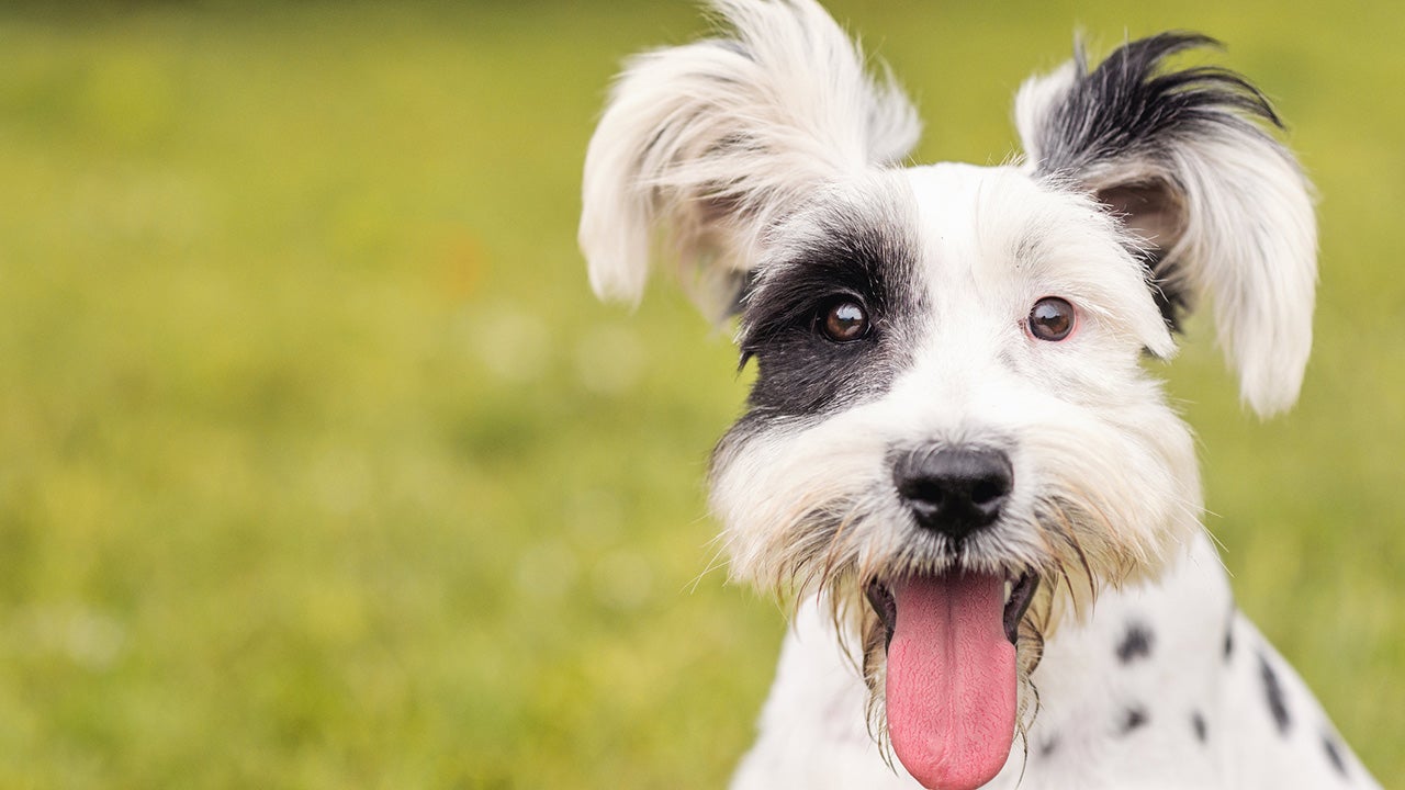 Black and White Schnauzer / Dalmatian dog sitting down with the tongue out