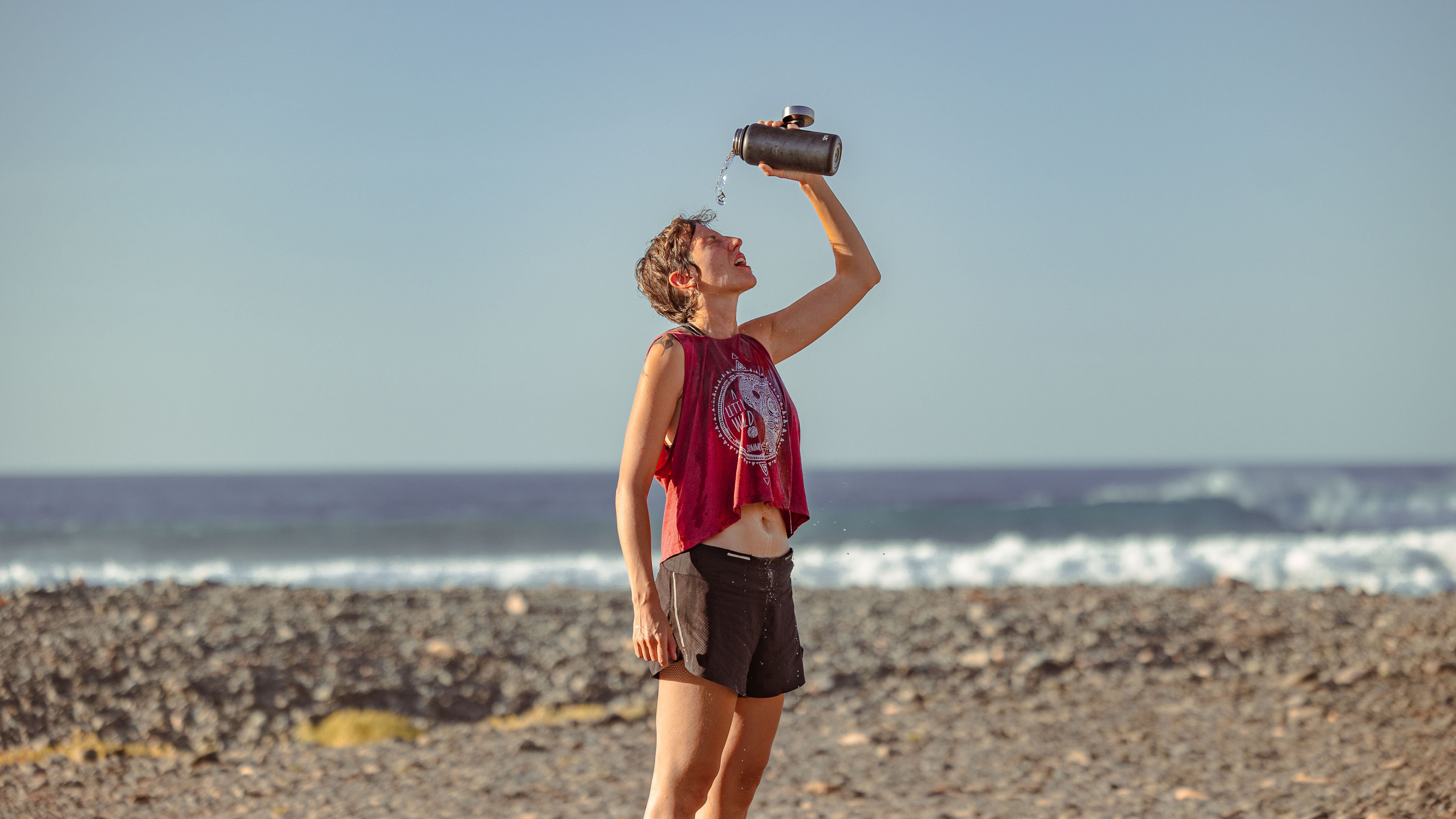 Young female runner dehydrated after exercising on the beach in Fuerteventura