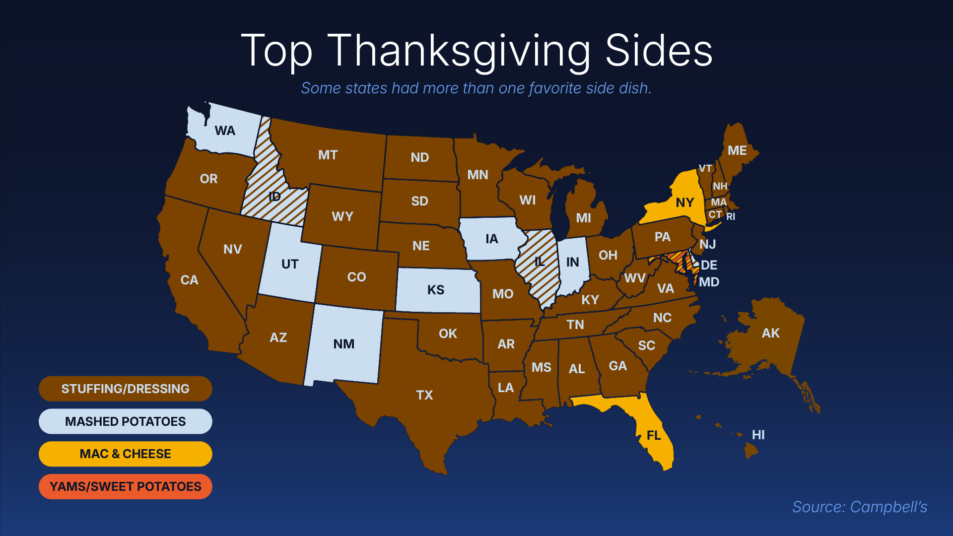 Sweet Potatoes/Yams was in the top three across 24 states, and it took second place in Arkansas, Maryland, Mississippi, New Jersey and New York.