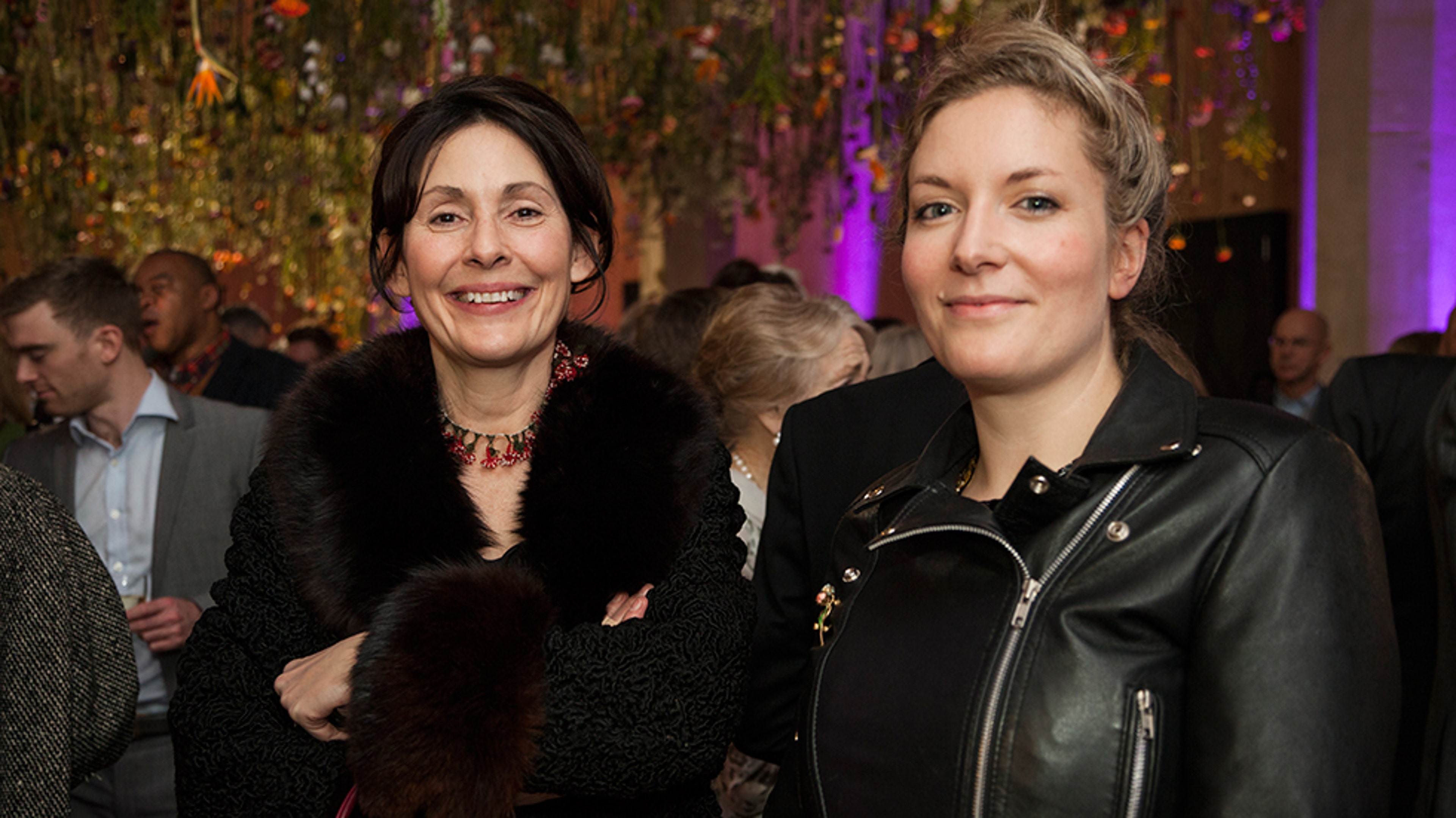 Exhibit curator Nicola Schulman stands on the left, beaming, with floral artist Rebecca Louise Law beneath Law's latest piece on display at London's Garden Museum.