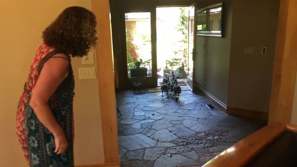 When some homeowners left their doors open to let in the breeze, a flock of geese paraded through.