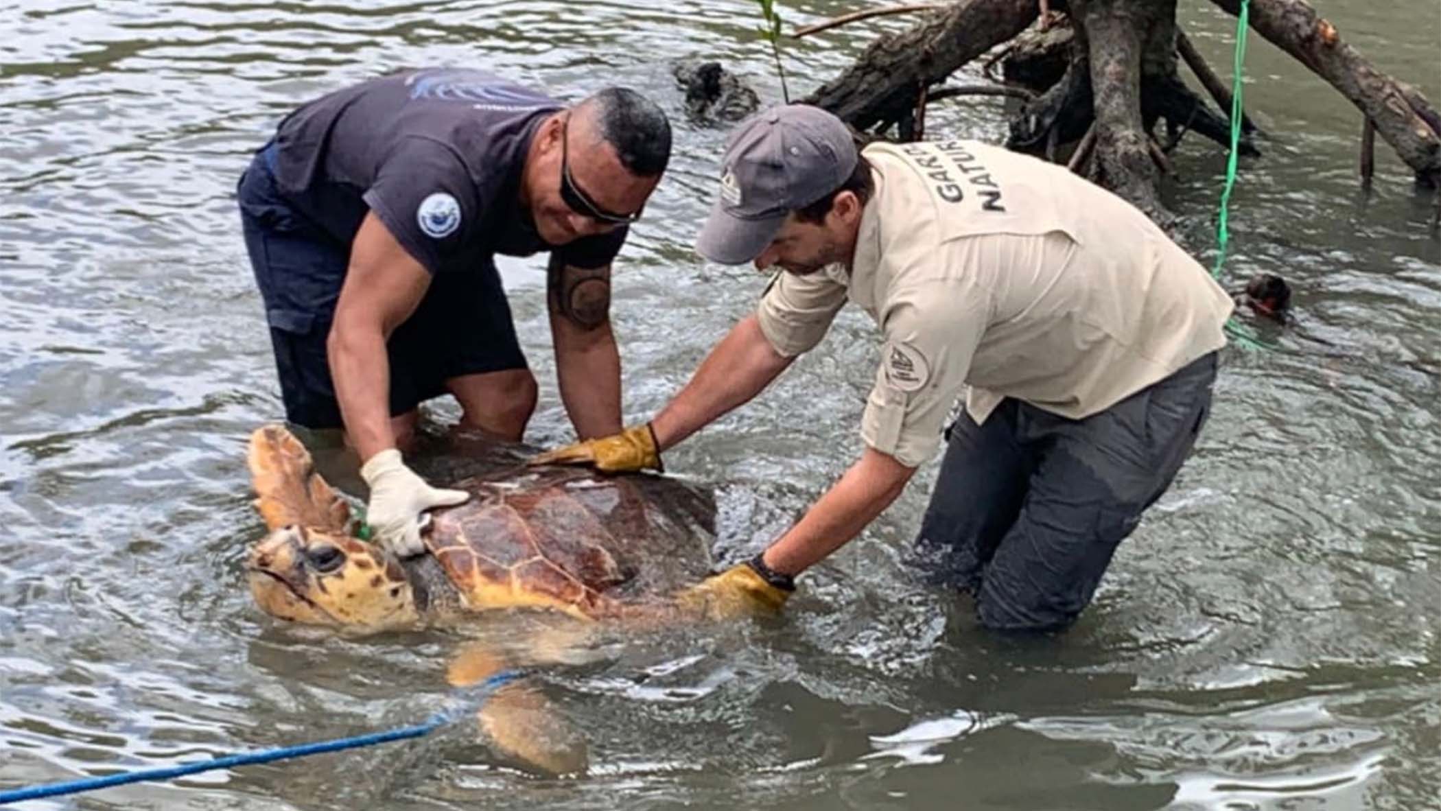 A female loggerhead turtle, believed to be 25 to 30 years old, was rescued in New Caledonia after being found bound in rope in a mangrove swamp, likely captured by a poacher.