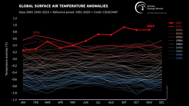 The monthly global temperature anomalies in 2023 (brightest red line) compared to previous years through November 2023.