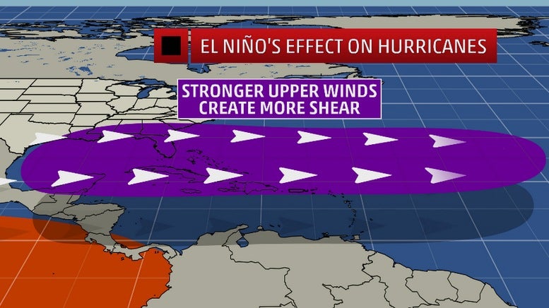 Stronger El Ninos can produce greater wind shear over parts of the Atlantic Basin, particularly the Caribbean Sea.