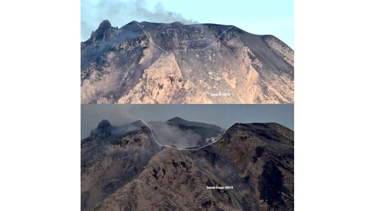 Indonesia’s Center for Volcanology and Geological Hazard Mitigation said the peak of the volcano was “completely annihilated” and shared before and after photos of the volcano showing a huge chunk missing from the top of the mountain.
